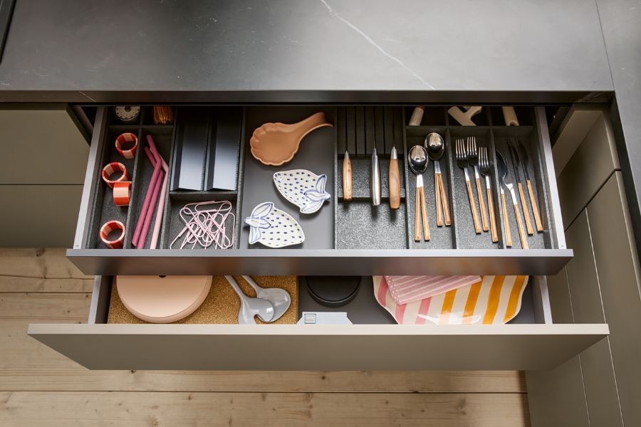Wat deze keuken opvallend maakt, is de balans tussen de warme kleur en de slimme functionaliteit. Open elementen zoals een elegant regaal met glazen schuifdeur in het schiereiland verbinden zichtbaarheid en opbergruimte. Daarbij zijn de fronten duurzaam geproduceerd, met een groot aandeel hernieuwbare materialen en 100% recyclebaarheid. Een keuze die niet alleen mooi is, maar ook verantwoord.